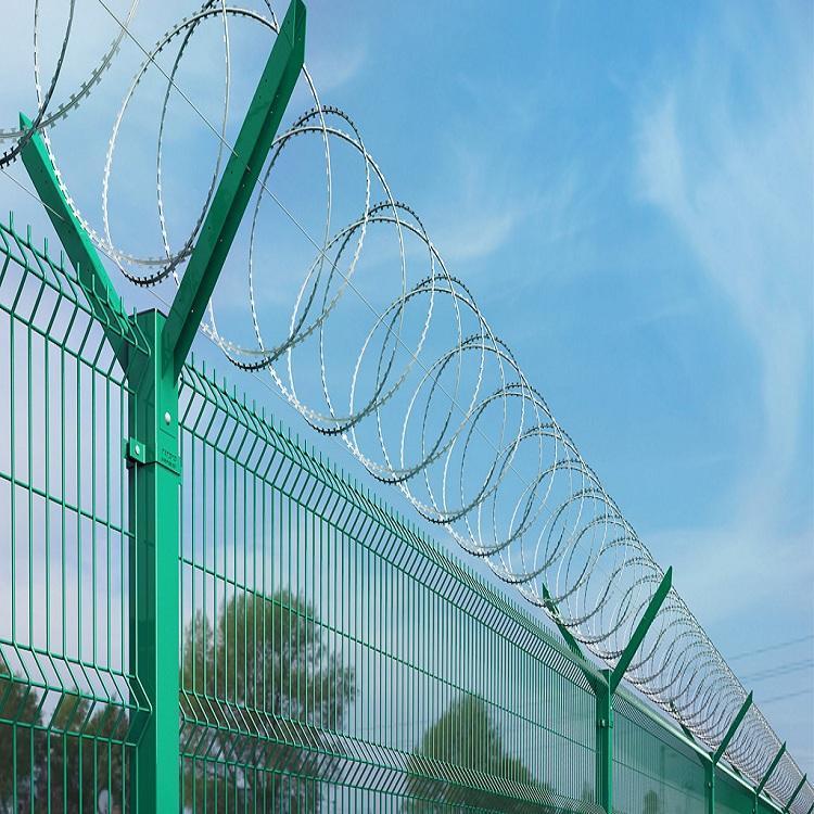 機場鋼筋網(wǎng)圍界浸塑:浸塑是將金屬構(gòu)件預(yù)熱后浸入流化狀態(tài)的塑料粉末中,以金屬構(gòu)件自身的熱量使粉末均勻沾附于 構(gòu)件表面,再進一步加熱使粉末充分熔融流平,冷卻后金屬表面即形成平滑的塑層.塑層厚度0.8-1.2mm.浸塑防腐比較適用于潮濕,多雨的氣候.質(zhì)量好的浸塑產(chǎn)品使用壽命可達10.