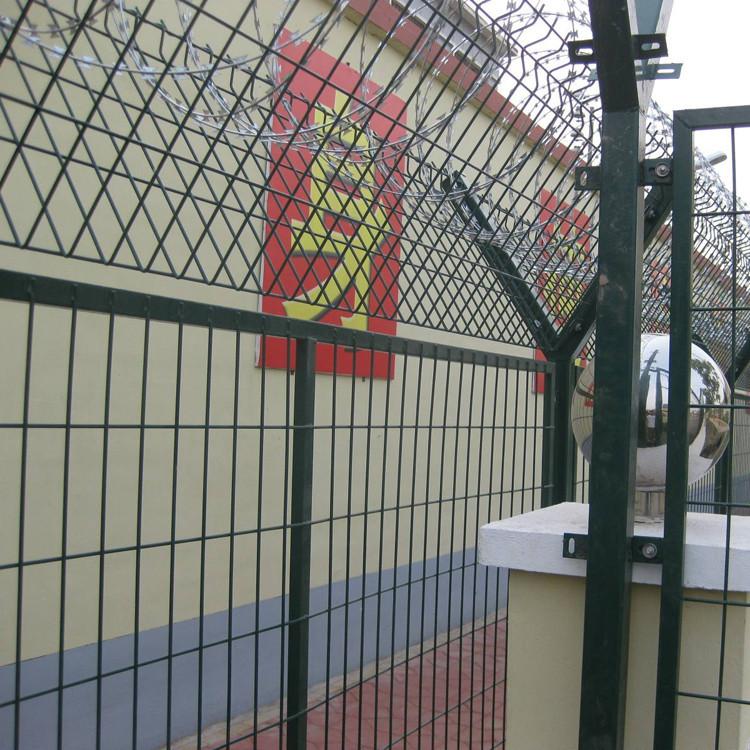 監(jiān)獄獄墻防護網(wǎng)由低碳鋼絲焊接而成,高度上下兩端折彎增加強度采用鋼筋焊接,具有防攀爬,抗沖擊,高安全防護特性特性,有效防止人員,家畜進入。