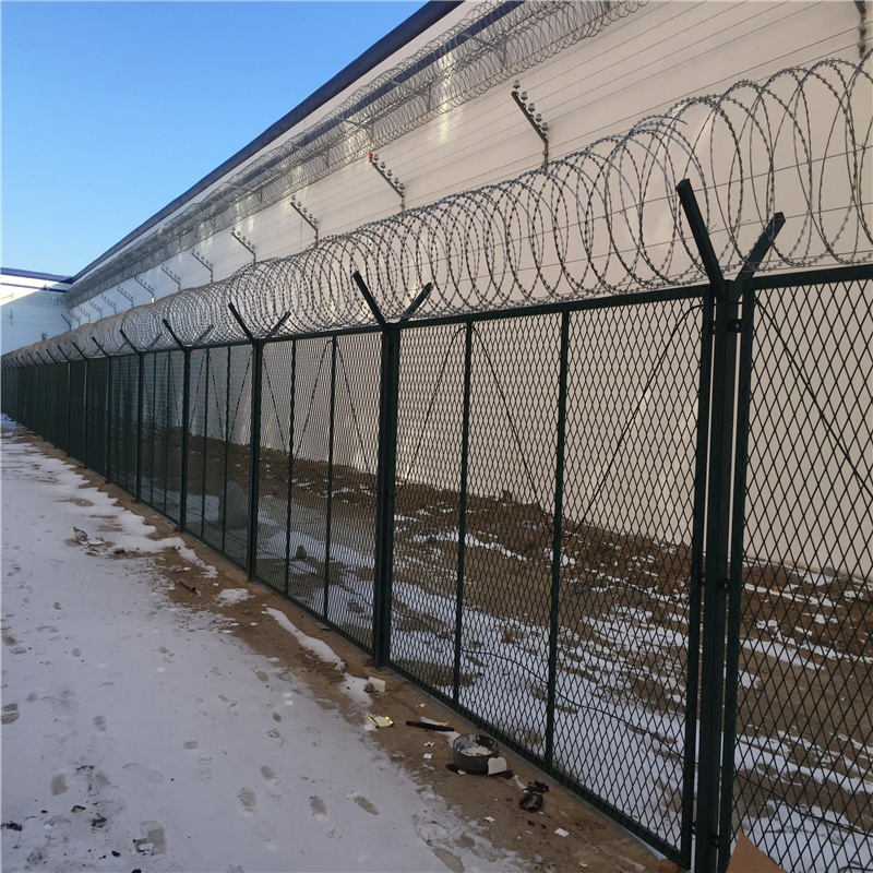部隊訓練基地圍欄網為了提高訓練效率和質量需要一個全封閉的場所。這種場區(qū)圍欄網需要措配使用蛇腹形刀刺網形成一段安全防御護網。下面的圍欄網使用強度好的鋼絲焊接,頂部再搭配刀刺網為軍人訓練營造一個好的封閉環(huán)境,是由V型支架立柱增強型焊接片網,平安防匪件和熱鍍鋅刀片刺籠構成強度和安全性級別很高,被遍及用于機場,軍事等場所。因為具有寧靜性高、防攀爬效果好,網片毗鄰特制SBS緊扣件, 有效防止人為的損壞性拆卸,橫向四道折彎增強筋,使網面強度明顯。