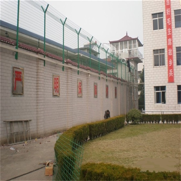 監(jiān)獄圍墻加高網(wǎng)通常采用鋼絲直徑為5mm、6mm、6,5mm,網(wǎng)孔采用50mm*100mm、50mm*50mm、50mm*200mm、50mm*150mm, 組成結構:首先把網(wǎng)片焊接在鐵管框架上,框架是方管或者圓管焊接成的框架結構,在框架上焊接用于個立柱連接的連接板,用防盜螺栓與立柱連接。為了保證網(wǎng)片的防拆卸性能,網(wǎng)片連接方式采用特制防盜緊扣件,有效防止人為的破壞性拆卸。
