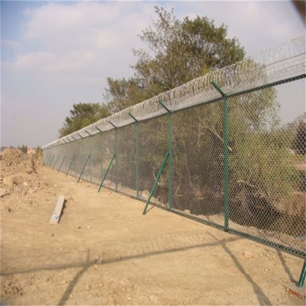 機場焊接防護隔離圍界:絲徑:4mm-6mm, 網(wǎng)孔:50*100mm 高度:1.8-3m  寬度:2-3m 頂部加防爬刺滾網(wǎng),另外一種焊接的防護隔離圍界是用刀片刺網(wǎng)直條焊接而成的,網(wǎng)孔一般為:75*150mm ,高度和寬度(同上),這種用刀片直條焊接的機場防護圍界,具有更好的防攀爬防隔離效果。