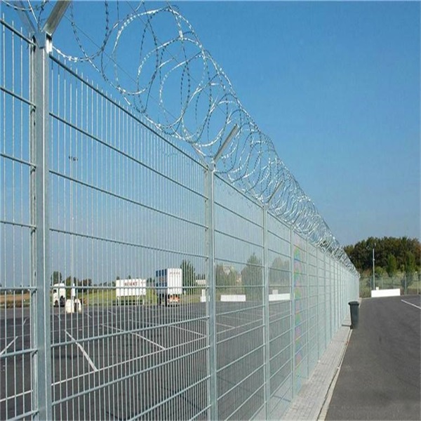 機場圍界V型網(wǎng)片頂部需安裝熱鍍鋅或不銹鋼刀片刺網(wǎng),有效的防止攀爬翻越機場圍界網(wǎng)。