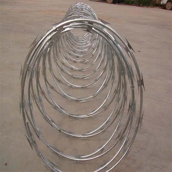 蛇腹型刀刺網(wǎng),由于各區(qū)域文化名稱差異也被叫做滾刀網(wǎng),蛇腹式刀刺網(wǎng)材料有中碳鋼絲、冷軋鍍鋅薄板,不銹鋼板,不銹鋼絲。蛇腹型刀片刺網(wǎng),上、下懸掛0.5米的交叉蛇腹型刀片刺網(wǎng),刀片刺網(wǎng)采用鋼板沖壓成型包附于鋼絲(筋絲)之上,由銳利尖角鋅鋼板或不銹鋼薄板做刀片,高張力鋼絲做芯線組合而成的。鋒利的刀型刺由雙線扣裝后成蛇腹狀既美觀又讓人不寒而粟。起到了很好的阻嚇作用。刀片刺網(wǎng)硬度好,制造及特點:鋼絲為芯絲,將沖壓好的刀片包裹在芯絲上,一次制成。產品具有超強的防護能力和恐嚇能力,安裝方便,壽命長。蛇腹型刀刺網(wǎng)的直徑常用的是500mm、600mm、800mm,其他規(guī)格均可定做,艾瑞廠家保證產品品質。