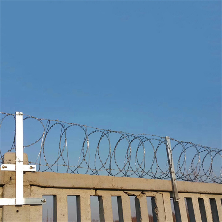 鐵路刺絲滾籠新建鐵路時速200公里以上,采用2.2米高度鋼筋混凝土防護柵欄+0.5米刺絲滾籠,設(shè)計時速200公里以下鐵路,一般地段采用1.8米高度鋼筋混凝土防護柵欄+0.5米刺絲滾籠,刺絲滾籠采用刀片刺繩繞圈后相鄰兩圈每隔120°用鐵絲連接卡固定,張開后形成蛇腹網(wǎng)狀,閉合后刀片刺繩圈徑為50cm,張開后每交叉圈安裝間距20cm,直徑不小于45cm,刺絲滾籠下緣距離鋼筋混凝土防護柵欄上緣的垂直距離為0.05米。