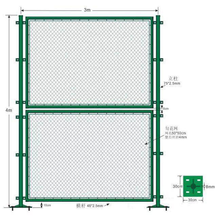 排球場地圍欄網(wǎng)包塑絲徑4.0mm網(wǎng)孔:50x50---80x80mm。防腐處理:網(wǎng)絲PVC包塑,立柱橫桿電鍍、噴塑、浸塑外理。連接方式:防盜螺栓卡接、扁鐵固定、組裝掛鉤。