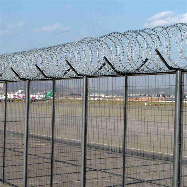 機(jī)場(chǎng)封閉鋼筋網(wǎng)主要用于飛行區(qū)場(chǎng)道形成一道封閉金屬圍界墻。機(jī)場(chǎng)鋼筋網(wǎng)具有防沖擊力和防剪切破壞的 能力,為了防止行人翻越,機(jī)場(chǎng)鋼筋圍網(wǎng)頂部會(huì)設(shè)置蛇腹形刀刺網(wǎng)增加防翻越效果。