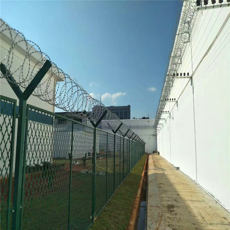 看守所隔離網(wǎng)又稱監(jiān)獄護(hù)欄網(wǎng)或刀片刺網(wǎng), 主要是采用高強(qiáng)度的刀片刺網(wǎng)與普通防護(hù)網(wǎng)的結(jié)合,由V型支架立拄,加強(qiáng)型焊接片網(wǎng),安全防盜連接件和刀片刺網(wǎng)組成。刀片刺網(wǎng)是一種新型防護(hù)網(wǎng),由銳利尖角鍍鋅鋼板或不銹鋼薄板做刀片,鋼絲做芯線組合而成的防護(hù)器材。