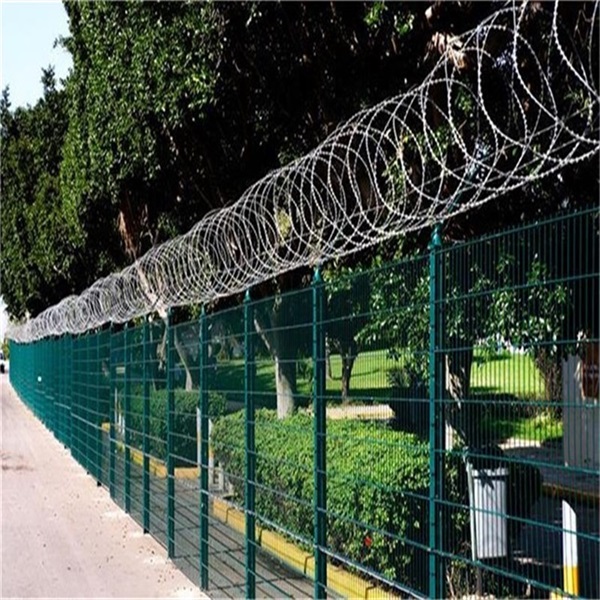 鋼筋網(wǎng)圍界、飛行區(qū)鋼筋網(wǎng)圍界網(wǎng)面是由直徑5mm的鋼筋排列成矩形網(wǎng)格點(diǎn)焊形成,相鄰橫筋間距不大于10cm,相鄰豎筋間距不大于5cm.每片鋼筋網(wǎng)片寬度不大于3m,用螺栓固定在事先埋設(shè)好的立柱上,為增加圍界的穩(wěn)定性,一般每30m左右增加一 個(gè)斜撐圍界上部50- -60cm以30.-45.角向外傾斜,或設(shè)置滾筒形刺鐵絲網(wǎng)防止攀越。
