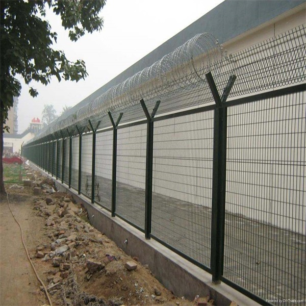 監(jiān)獄、看守所金屬隔離鋼網(wǎng)墻是由銳利尖角鍍鋅鋼板或不銹鋼薄板做刀片,鋼絲做芯線組合而成的防護(hù)器材,具有嚇阻、防翻越等效果,材質(zhì)堅(jiān)硬,高強(qiáng)度,高張力,造型設(shè)計(jì)獨(dú)特,不宜觸摸,因而能達(dá)到極好的防護(hù)隔離效果。又名刀刺鋼網(wǎng)墻,采用大直徑高強(qiáng)度合金鋼絲制作,具有防攀爬、抗沖擊、抗剪切特性和良好的震慎作用,主要是采用高強(qiáng)度的刀片刺網(wǎng)與普通防護(hù)網(wǎng)的結(jié)合,由V型支架立拄加強(qiáng)型焊接片網(wǎng),安全防盜連接件和刀片刺網(wǎng)組成。專用于監(jiān)獄看守所、警戒線軍事基地等高安全領(lǐng)域。