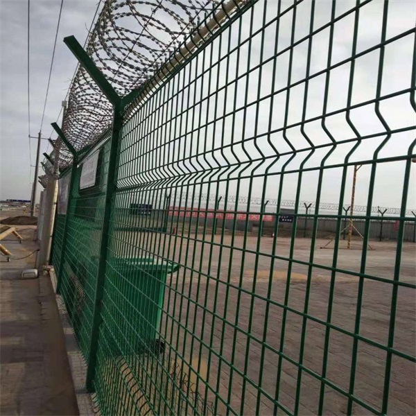 機場鋼絲圍欄網(wǎng)具有很好的防老化、防曬、耐候等特點。其產(chǎn)品造型美觀、花色多樣,既起到圍欄作用,又起到美化作用。由于具有安全性高、防攀爬能力好,網(wǎng)片連接方式采用特制SBS緊扣件,有效防止人為的破壞性拆卸,橫向四道折彎加強筋,使網(wǎng)面強度顯著增加﹑。