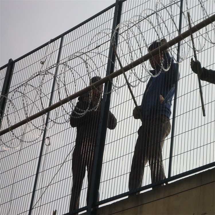 看守所監(jiān)墻內(nèi)側(cè)刀刺鋼網(wǎng)墻高度設(shè)置問題。看守所刀刺鋼網(wǎng)墻高度有2.5m和4.5m兩種,也是常用的兩種。這兩種高度都包括頂部50公分蛇腹網(wǎng),底部為刀刺鋼網(wǎng)墻。4m高刀刺鋼網(wǎng)墻可以用上下兩片來連接。