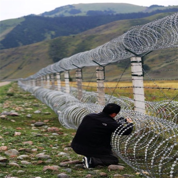 邊境蛇腹形鐵絲網(wǎng)安裝固定需要支架立柱固定,然后有固定的拉絲架設(shè)蛇腹形鐵絲網(wǎng),刺絲滾籠采用刀片刺繩繞圈后相臨兩圈每隔120°用刺絲連接卡固定,張開后形成蛇腹網(wǎng)狀,閉合后刀片刺繩圈徑為50cm,邊界刺鐵絲網(wǎng)價(jià)格,張開后每交叉安裝間距20cm,直徑不小于45cm交貨時(shí),刺絲滾網(wǎng)(籠)成品應(yīng)為按此條要求用刺絲連接卡固定好的成籠。