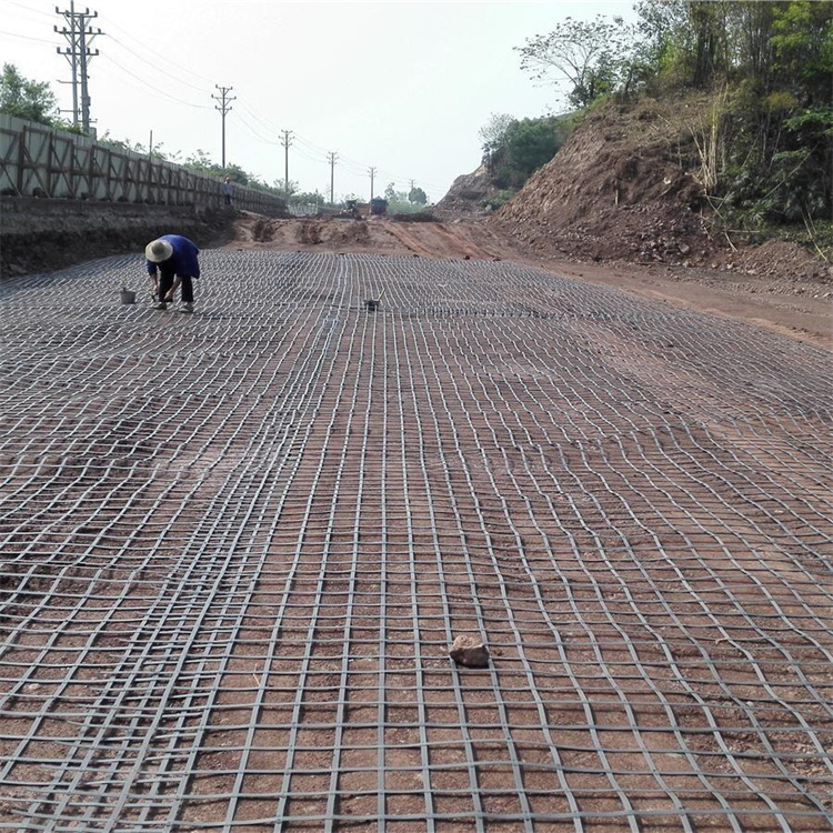 鋼塑土工格柵以高強(qiáng)鋼絲(或其他纖維),經(jīng)特殊處理,與聚乙烯(PE),并添加其他助劑,通過(guò)擠出使之成為復(fù)合型高強(qiáng)抗拉條帶,且表面有粗糙壓紋,則為高強(qiáng)加筋土工帶。由此單帶,經(jīng)縱、橫按一定間距編制或夾合排列,采用特殊強(qiáng)化粘接的熔焊技術(shù)焊接其交接點(diǎn)而成型,則為加筋土工格柵。