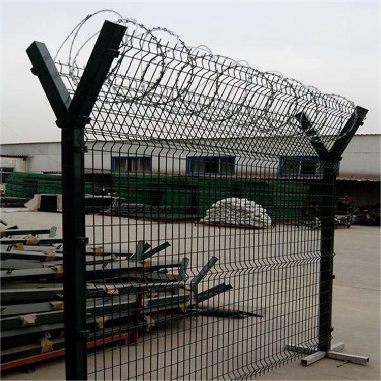 1、機場護欄網(wǎng)也被稱為機場護欄或Y型安全保護網(wǎng),由V形支架立柱,加強焊接網(wǎng)片,安全防盜聯(lián)接件和熱浸鍍鋅刀片組成。