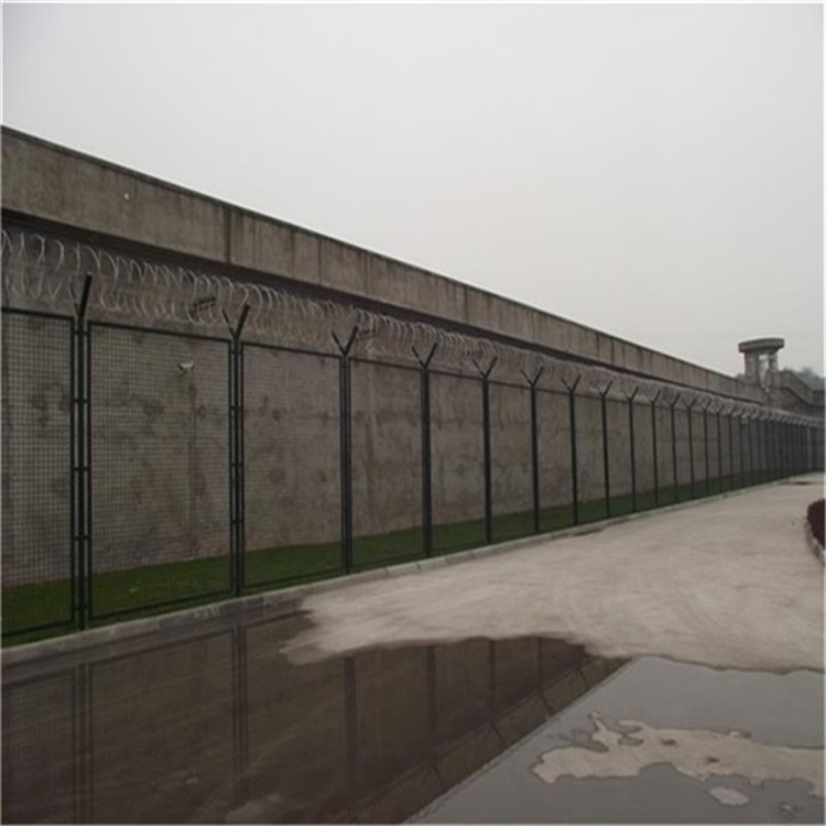 看守所隔離網(wǎng)又稱監(jiān)獄護(hù)欄網(wǎng)或刀片刺網(wǎng), 主要是采用高強(qiáng)度的刀片刺網(wǎng)與普通防護(hù)網(wǎng)的結(jié)合,由V型支架立拄,加強(qiáng)型焊接片網(wǎng),安全防盜連接件和刀片刺網(wǎng)組成。刀片刺網(wǎng)是一種新型防護(hù)網(wǎng),由銳利尖角鍍鋅鋼板或不銹鋼薄板做刀片,鋼絲做芯線組合而成的防護(hù)器材。
