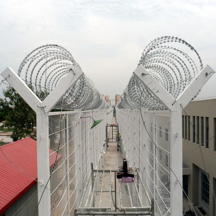 監(jiān)獄看守所巡邏道防護網(wǎng)用途:用于監(jiān)獄、看守所、拘留所、戒毒所、軍事禁區(qū)、邊防線等高安全場所。 監(jiān)獄隔離網(wǎng)具有結(jié)構(gòu)新穎、堅固緊密、網(wǎng)面平整、網(wǎng)孔均勻、刀鋒銳利、防攀爬防腐蝕性強等特點。