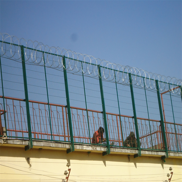 2、監(jiān)獄看守所巡邏道防護網(wǎng)一般使用熱鍍鋅鋼絲焊接或鋼絲焊接后鍍鋅再做涂塑處理,達到雙重防腐。