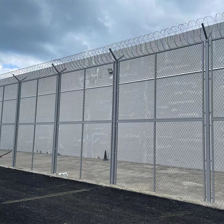看守所鐵絲網(wǎng)通常采用鋼絲直徑為5mm、6mm、6.5mm,網(wǎng)孔采用50mm*100mm、50mm*50mm、50mm*200mm、50mm*150mm, 組成結(jié)構(gòu):首先把網(wǎng)片焊接在鐵管框架上,框架是方管或者圓管焊接成的框架結(jié)構(gòu),在框架上焊接用于個(gè)立柱連接的連接板,用防盜螺栓與立柱連接。為了保證網(wǎng)片的防拆卸性能,網(wǎng)片連接方式采用特制防盜緊扣件,有效防止人為的破壞性拆卸。