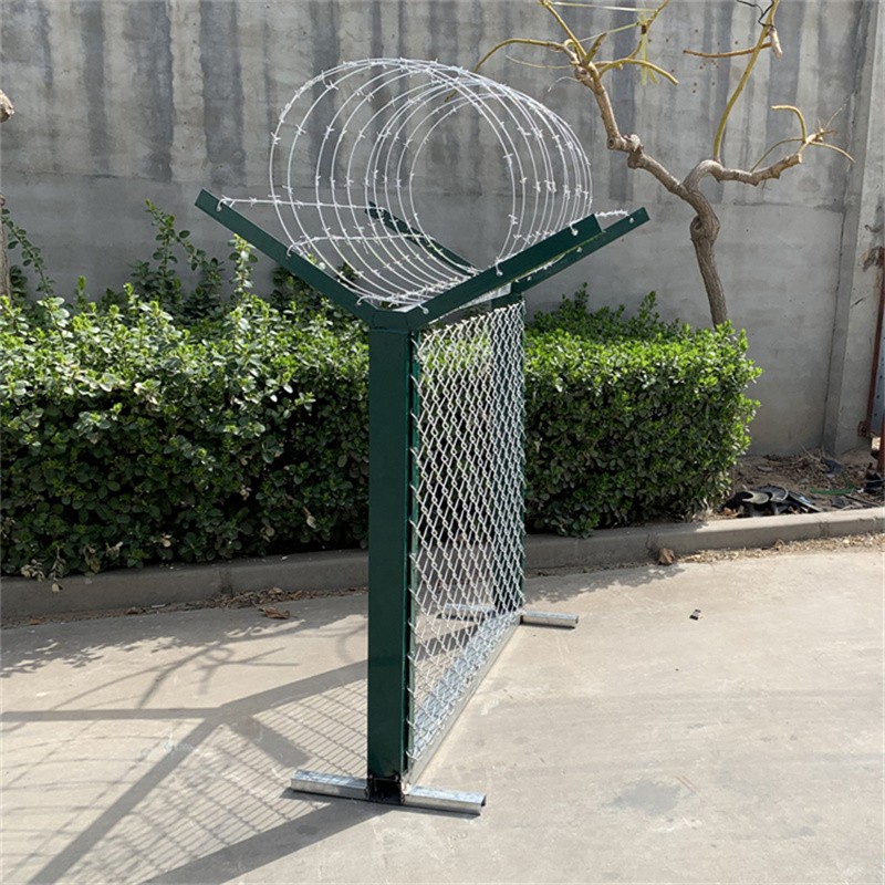 8、 鋁包鋼絲菱形網(wǎng)采用冷拉低碳鋼絲外徑包裹鋁層的防腐處理,鋁包鋼絲抗拉強度應(yīng)達到500Mpa,立柱采用由冷軋鋼帶直縫焊接而成的矩形燕尾鋼管并做內(nèi)外防腐處理,要求鋼帶抗拉強度應(yīng)達到375Mpa;斜撐采用由熱軋鋼帶直縫焊接而成的矩形鋼管并做內(nèi)外防腐處理,要求鋼帶抗拉強度應(yīng)達到375Mpa。延伸臂由熱軋角鋼焊接而成并做防腐處理,要求抗拉強度應(yīng)達到375Mpa。鋁包鋼絲滾籠為主絲直徑3.0mm的冷拉高碳鋼絲,抗拉強度應(yīng)達到1340Mpa;刺絲為直徑2.2mm的冷拉低碳鋼絲,抗拉強度應(yīng)達到500Mpa,鋁包鋼刺絲為主絲直徑2.8mm的冷拉高碳鋼絲,抗拉強度應(yīng)達到1340Mpa;刺絲為直徑2.2mm的冷拉低碳鋼絲,抗拉強度應(yīng)達到500Mpa,間距均為100-200mm。鋁包鋼絲滾籠與刺鋼絲采用不銹鋼扎絲連接,沿長度方向每隔500mm設(shè)4個連接處。