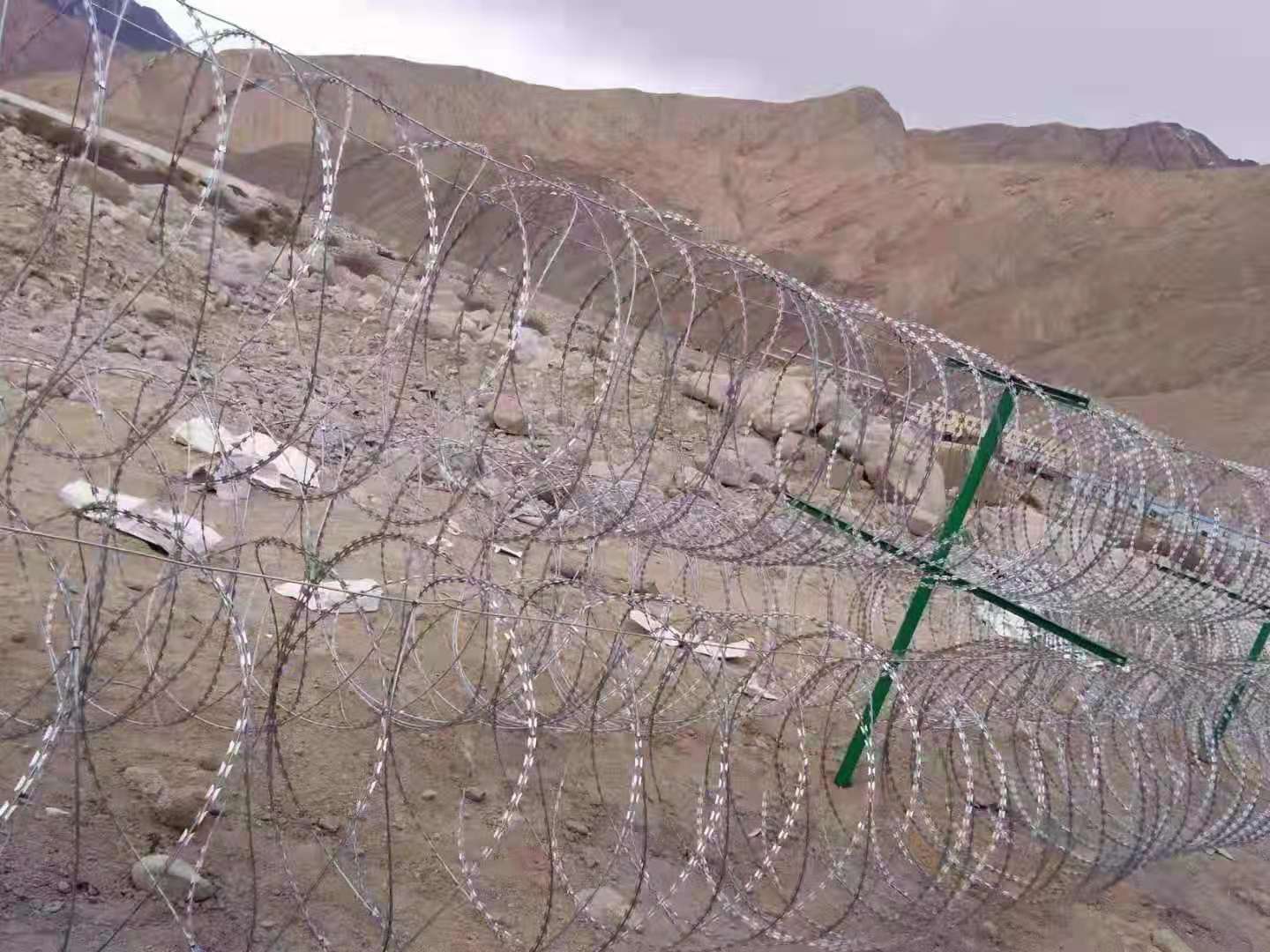 邊境防護鐵絲網的結構分類總結:Y字型邊境鐵絲網、干字形邊境鐵絲網、品字型邊境鐵絲網、211型邊境鐵絲網、T字型邊境鐵絲網,這幾種鐵絲網都是由普通刺絲(12號熱鍍鋅鐵絲,刺花為14號熱鍍鋅鐵絲,刺花為四刺,刺花間距8-10cm,刺廠1.7-2cm,每個花距4個扭股,刺鐵絲截面每平方米鍍鋅量在200g以上,每卷刺鐵絲重量25±1kg,其他參照GB/T343-94,GB/T15393-94標準執(zhí)行。)和刀片刺絲(刀片刺繩由沖切鋼板采用機械壓軋在鋼絲上成型,刀刺寬度22mm,兩刃垂直間距15mm,刀刺縱向間距34mm,芯絲直徑為2.5mm,刀片采用厚度0.5mm的q195鋼板沖切制作,芯絲由hpb300∮6.5mm高線鋼絲冷拔加工。)架設形成。