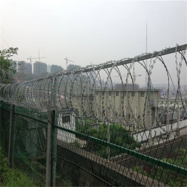 圍墻防護刀刺滾網(wǎng)也稱為刀片刺絲、刀片刺網(wǎng),是一種新型防護網(wǎng)。由銳利尖角鍍鋅鋼板或不銹鋼薄板做刀片,高張力鋼絲做芯線組合而成的阻絕器材。電泳的圍墻安全防護刀刺滾網(wǎng)是將做好的刀片刺網(wǎng)再進行噴塑表面處理,使得刀片刺網(wǎng)與外面空氣形成一種具有隔離層的空間。該產(chǎn)品具有嚇阻效果好。美觀。施工便利。經(jīng)濟實用等優(yōu)異特點。主要用于園林公寓。機關(guān)單位。監(jiān)獄。哨所。邊防等的圈禁防護。